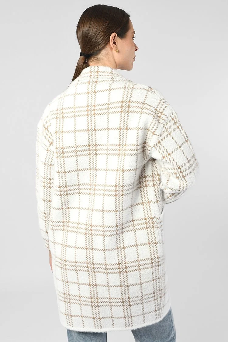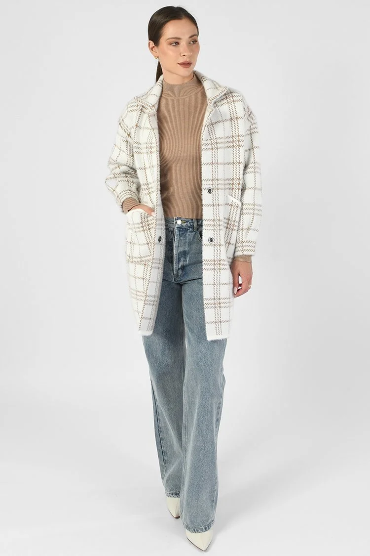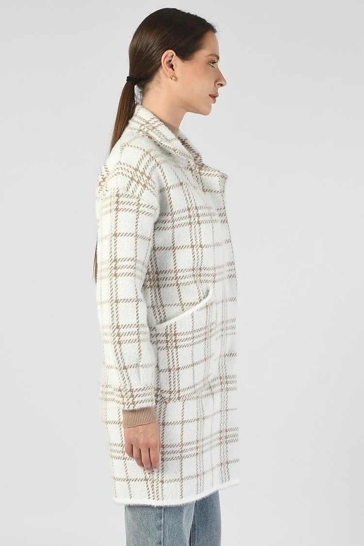 Elegant white and beige plaid long coat with a relaxed fit and large pockets. A versatile and cozy addition to any wardrobe